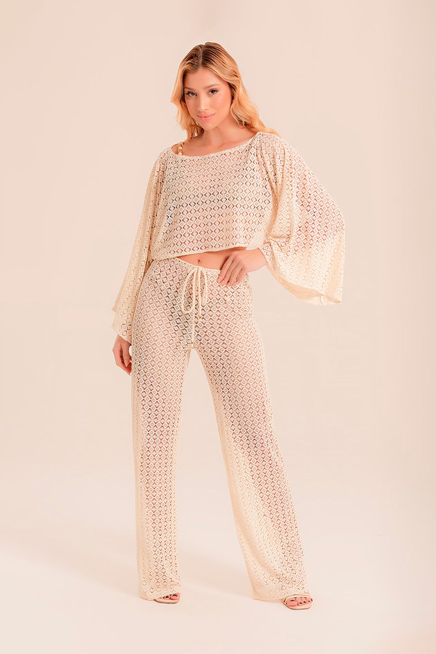 Elegante e leve, essa calça em rendão apresenta modelagem reta e cordão na cintura para regulagem, proporcionando ajuste confortável e versátil. Perfeita para quem busca compor looks estilosos e frescos, é uma peça que combina praticidade com sofisticação.