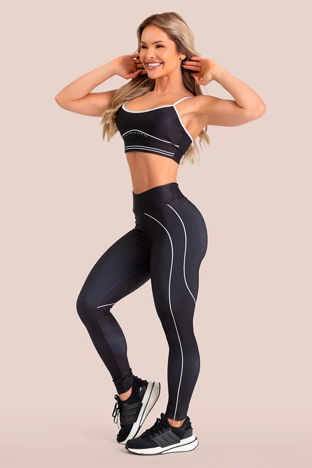 A legging envolve o corpo com precisão, enquanto o top sem bojo proporciona liberdade, conforto e leveza.