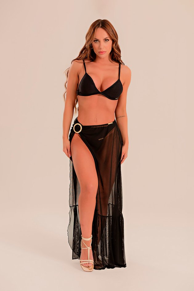 Saia elegante com babado na barra que adiciona movimento ao visual, combinada com detalhe em argola de resina, trazendo sofisticação e modernidade. Modelo versátil, ideal para compor looks femininos e contemporâneos.